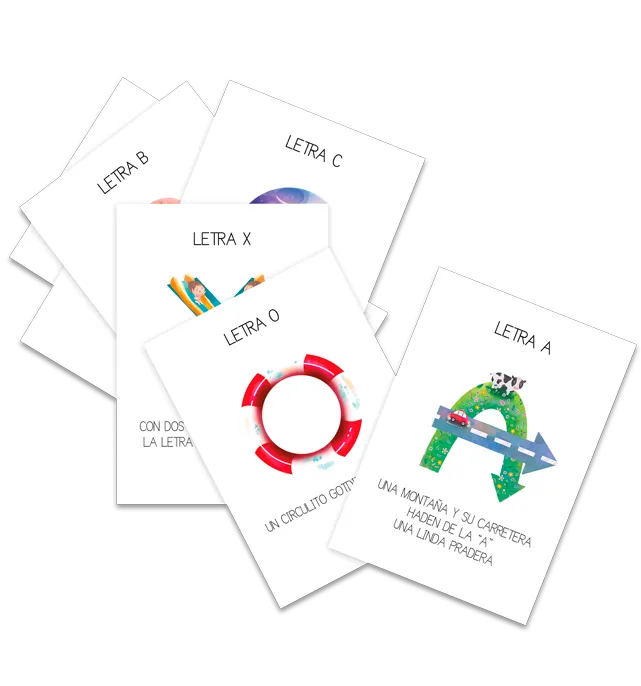 Son piezas donde se conjuga la dirección de un trazo con algo significativo y sencillo para ellos. Partiendo de estas piezas se montarán las letras tanto mayúsculas como minúsculas. El material también incluye unas tarjetas donde aparecen las letras montadas y una retahíla para aprender y recordar los trazos de cada letra.