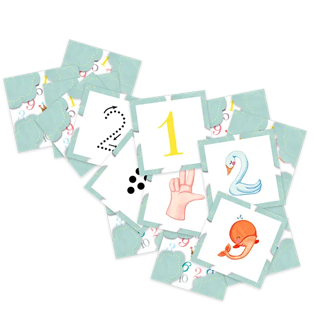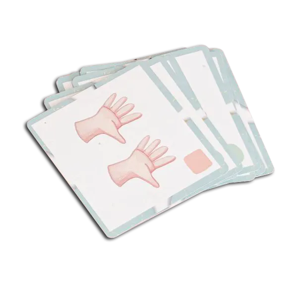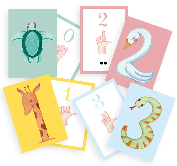 Once tarjetas individuales a doble cara del 0 al 10. Por un lado el Ánimágico y por otro lado el número, la mano y los puntitos correspondientes a ese número.