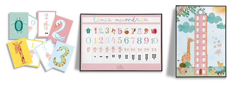• Póster de la línea numérica: para localizar, identificar y comparar los números. Les servirá de apoyo de actividades como el conteo, de correspondencia grafía-cantidad o de descomposición.
