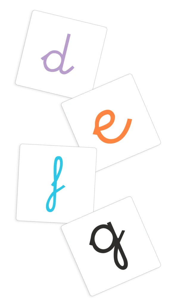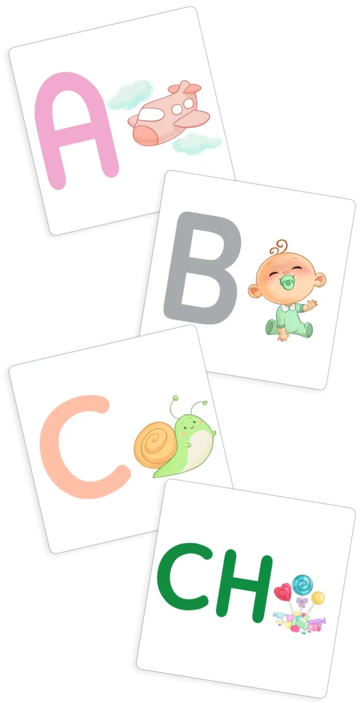 Las cartas cuentan a su vez con dos caras, una con la letra en mayúscula y su imagen asociada y en el reverso en minúscula.